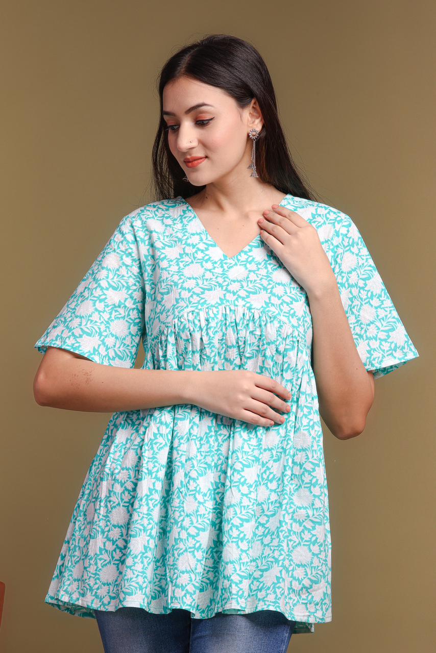 Cotton Printed V-neck Relaxed Fit Short Kurta