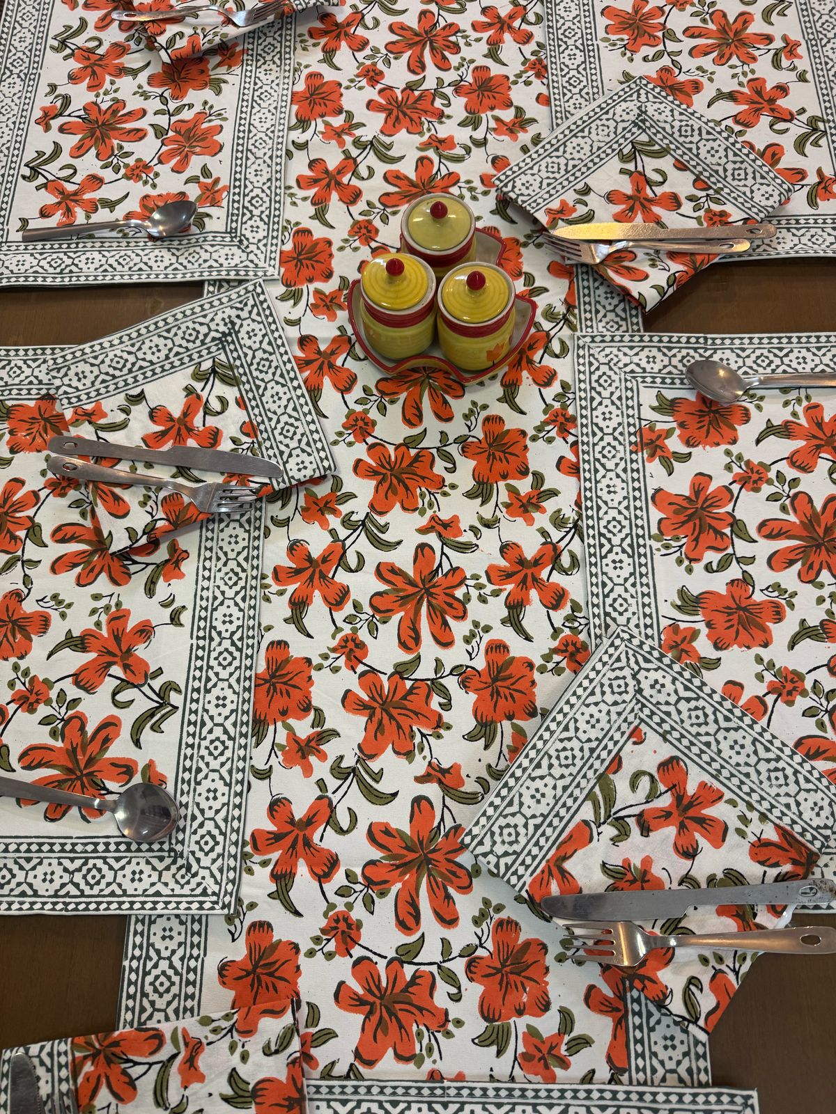 Hand Block Printed 6-seater Dining Set with Runner, 6 Table Mats & 6 Napkins